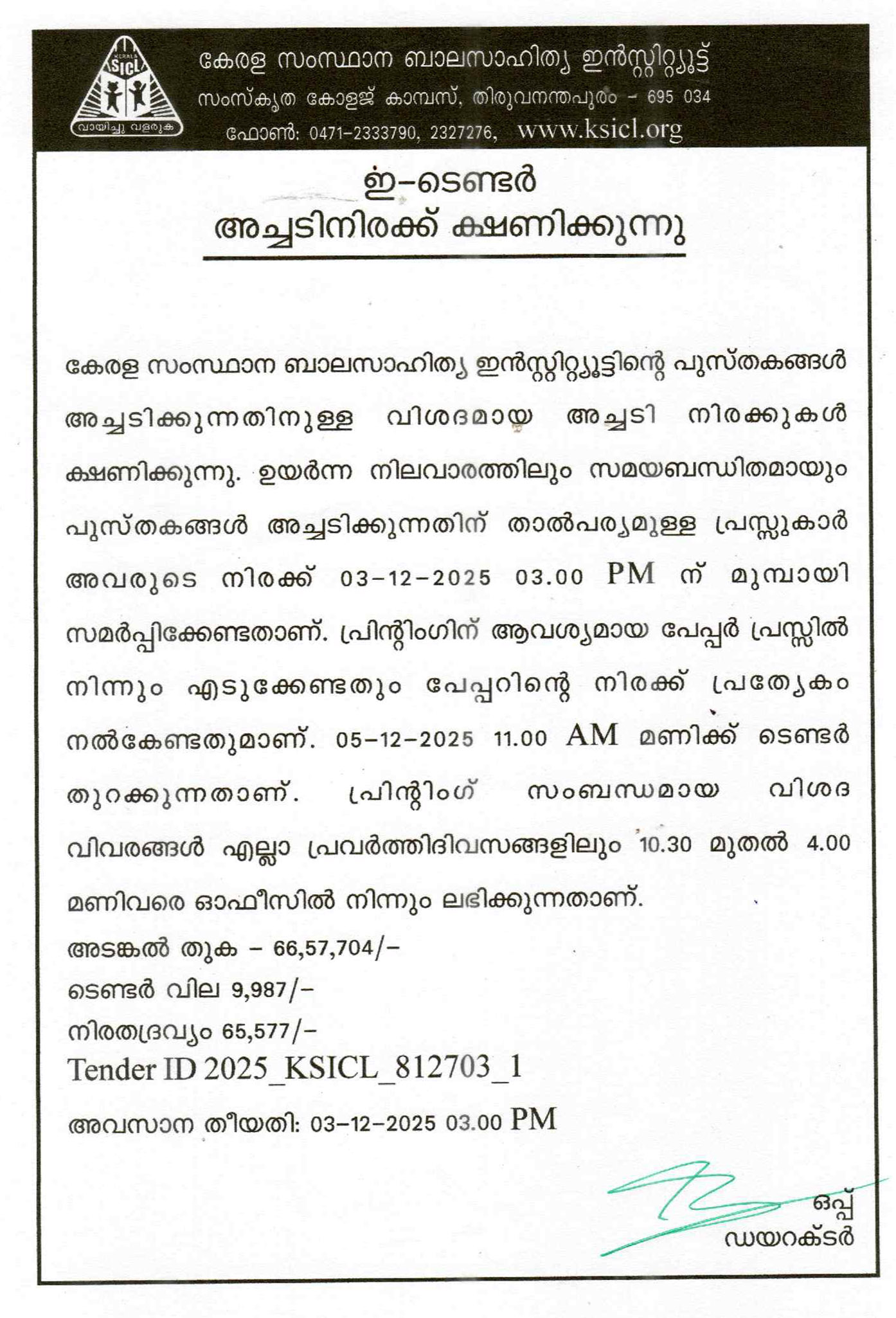 പുസ്തകങ്ങളുടെ അച്ചടി – ടെണ്ടർ ക്ഷണിക്കുന്നു. ഒക്ടോബർ 28, 2025 ksicl user പുസ്തകങ്ങളുടെ അച്ചടി – ടെണ്ടർ ക്ഷണിക്കുന്നു.